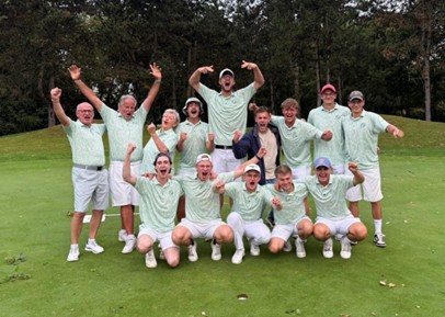 Die oben erwähnten Tugenden des sich in eine Runde rein kämpfen wurden erneut auf eine harte Probe gestellt und wieder einmal mit Bravour gemeistert. Nix für schwache Nerven, dafür umso befriedigender, wenn das Comeback gelingt. Nach den Einzeln trennte uns 1 Schlag vom Sieg des Spieltages. Würde man an dieser Stelle „abpfeifen“, so wären wir dennoch aufgestiegen. Am Nachmittag in den Vierern dann erneut der Nervenkitzel, der sich aber nach 9 Loch in das beruhigende Gefühl wandelte, NUR noch durchkommen zu müssen. Wer in mentalen Dingen ein wenig zuhause ist, der kennt sicher den Unterschied von „Hin zu statt weg von“. Nur eine gute Ausgangslage zu verteidigen, ist fast schwieriger als weiter nach vorne zu spielen. Mit einem Paukenschlag ist uns dies trotzdem gelungen. Eagle an der langen 12 in Hof Hausen, gefolgt von einem Tap in Birdie an Loch 13. Und während sich zu unseren Gunsten der Abstand zu unseren Verfolgern vergrößerte, reduzierte sich der Abstand zum heranziehenden Gewitter so sehr, dass alle Spieler vom Platz geholt werden mussten. Wir lagen zu diesem Zeitpunkt 5 Schläge in Führung und hätten, bis zu dem Zeitpunkt das „verlorene Schläge“ auf die Meisterschaft wirken, noch mehr als 10 Schläge aufgeben müssen. Da zu diesem Zeitpunkt auch im Abstiegskampf bereits alles klar war, haben die Kapitäne einstimmig beschlossen den Spieltag an dieser Stelle abzubrechen, womit nur die Einzel des Vormittages in die Wertung kamen. Um 18:25 waren wir offiziell Meister und dürfen uns nun auf die 2. Bundesliga im nächsten Jahr freuen.